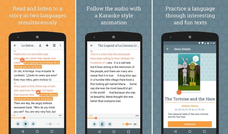 Beelinguapp is an app specifically designed to help you improve reading comprehension in a foreign language. The app lets you read and listen to stories in different languages side by side. You can read text and hear audio in the language you are learning, and read the same text in your native language to use as a reference. The app includes support for languages such as English, German, Spanish, Hindi, Portuguese, French etc.